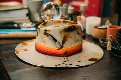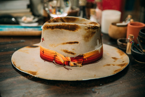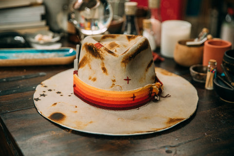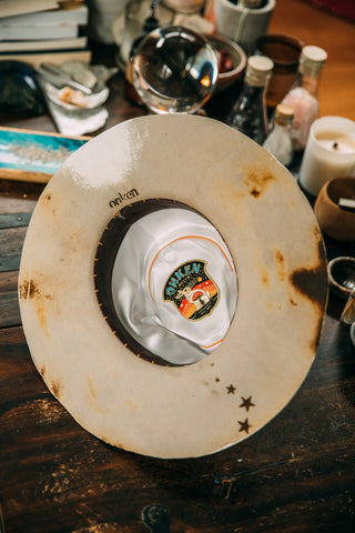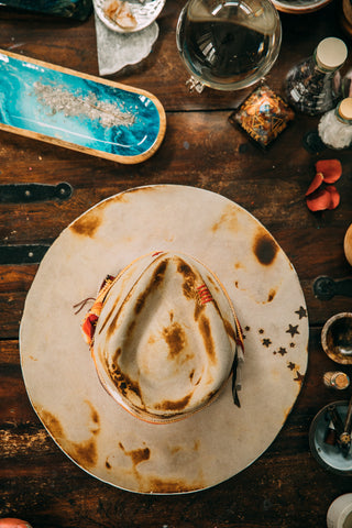 This western weight beauty was lit on fire and toasted to perfection to give it a worn look. It has one of my favorite ombre striped Pendleton fabric strips wrapped around the crown. Two sticks of Selenite and a feather tucked into the fabric strip. A hand painted plus sign on the back along with red hand stitched plus signs on the front for positivity. Burned in stars coming out of the Selenite sticks for that stardust energy. It has a trickle of stars coming out from the front center of the brim which shows up well in photos when you're wearing it. A little hand painted strip on the back under the brim, and parts of the brim edges painted white.
