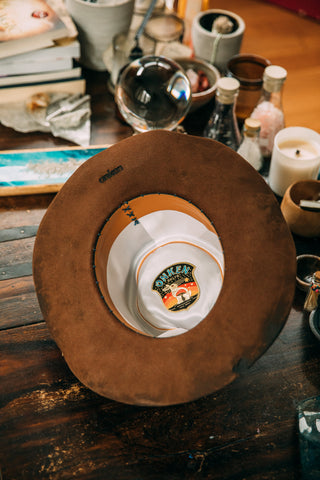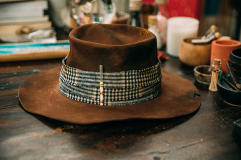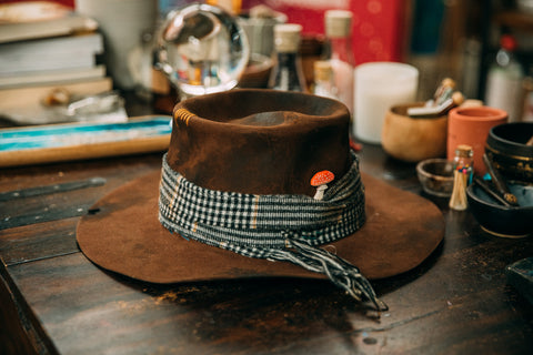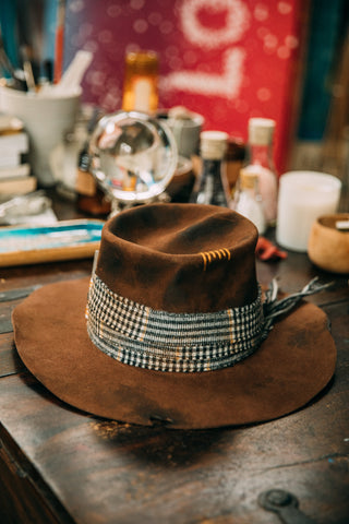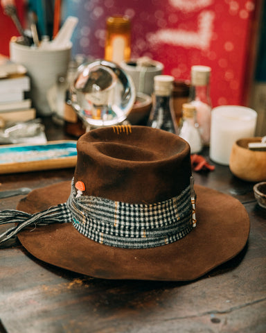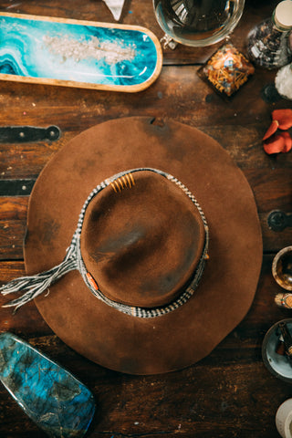 This heavy weight stiff brown beaver felt was hand shaped and toasted to perfection. It has a double wrapped Pendleton fabric strip around the crown, a white paint dipped stick of Selenite, and some gold drips down the crown. It has an Amanita Muscaria mushroom pin on the side.