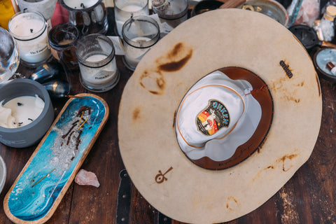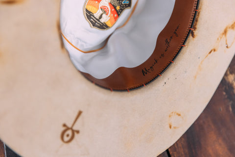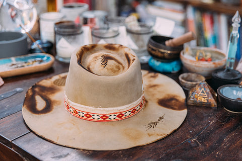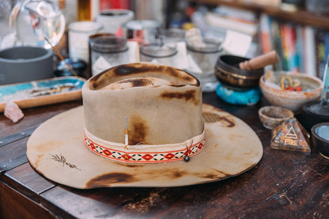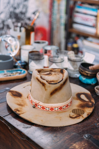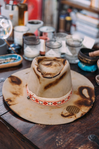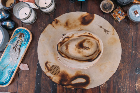 This one is a unique crown shape as you'll see from the front it twists down. A sand color felt that was heavily toasted. Light codes on the brim and top as well as a flower of life sacred geometry encoded on the front right of the brim. A coffee dyed linen band under the south west style fabric strip. An Ankh symbol on the bottom of the front of the brim. Of course a paint dipped stick of Selenite for the highest vibrations.