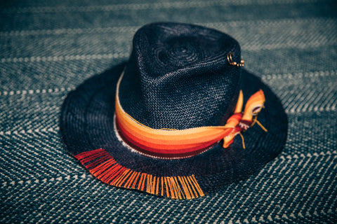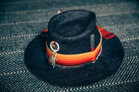 Blue Panama style with a rare vintage band cut from a piece of Pendleton fabric. Hand stitched ombre strips sewn into the front of the brim. One of Canadian native made dream catcher for the back of the crown. Of course a stick of Selenite as the highest vibrational stone to bring you high vibes. A gold loopy safety pin for good measure.