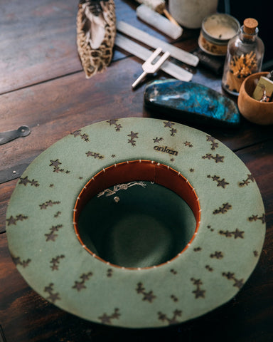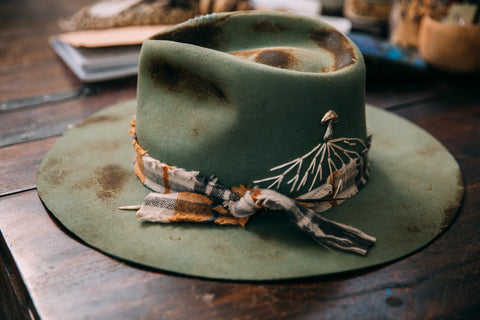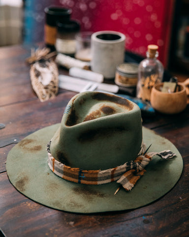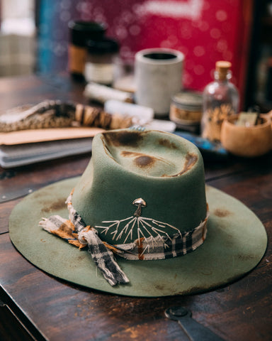 I wanted earth tones for this hat so I went with a Eucalyptus green color and torched it with fire to give it an earthy forest vibe. I found this amazing mushroom pin, and hand stitched a mycelium network coming from it. The crown wrap is a fabric scrap from Pendleton. A porcupine quill on the side.