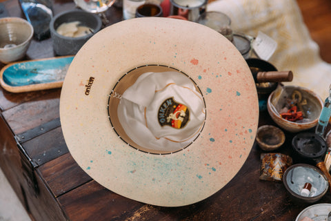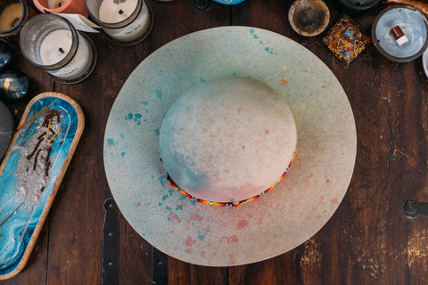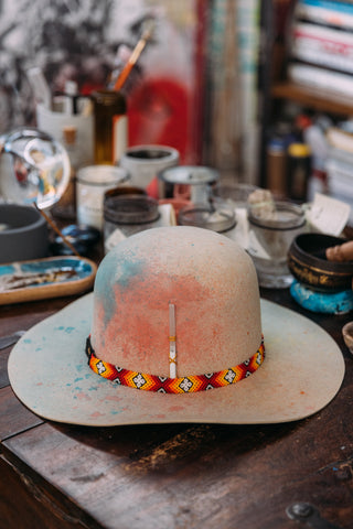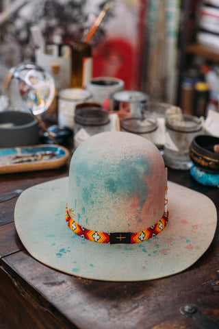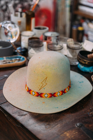 This full open crown western style hat has been lightly spray dyed all over a rainbow of colors. The brim is slightly curved up on the sides like a cowboy hat. It has a golden hand stitched lightening bolt on the front of the crown, a large stick of Selenite for the highest vibes, and a Peyote band had crafted by the Peyote shamans of Mexico.