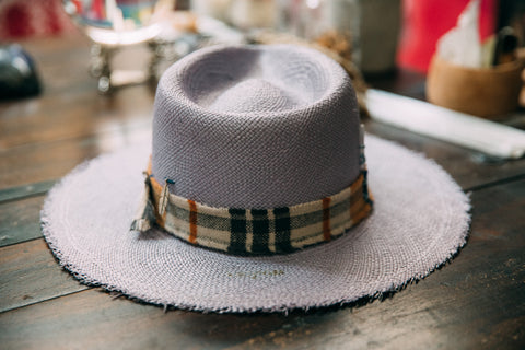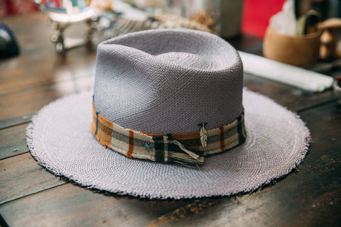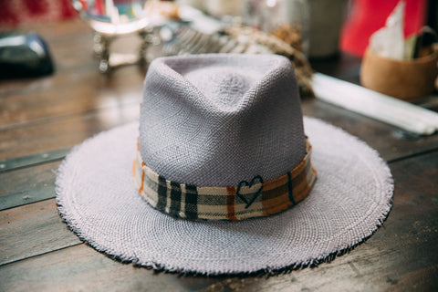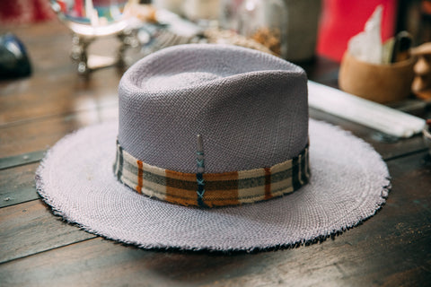 This pastel purple Panama is a great one for the summer. It's light and fun with a Pendleton fabric strip, hand stitched heart on the front, of course a stick of selenite for the highest vibrations. A silver feather for healing.