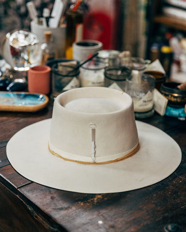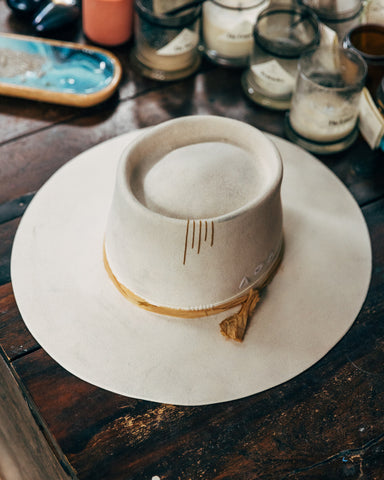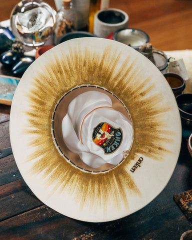 This all white gaucho style crown has gold drips coming down the side hand stitched, and white alchemy symbols hand stitched on the sides. It's got white leather strips wrapped around the crown underneath the botanical dyed gold yellow silk wrap. Underneath the brim is radiant rays of golden light moving outward from the center by way of Tribal Markers. Of course a stick of Selenite white dipped paint for the highest vibes.