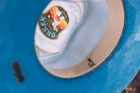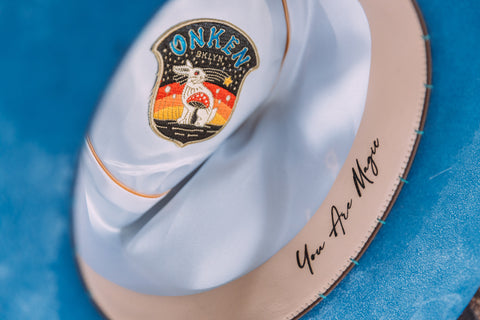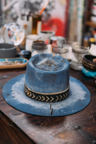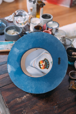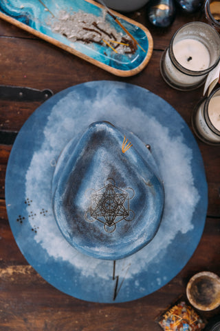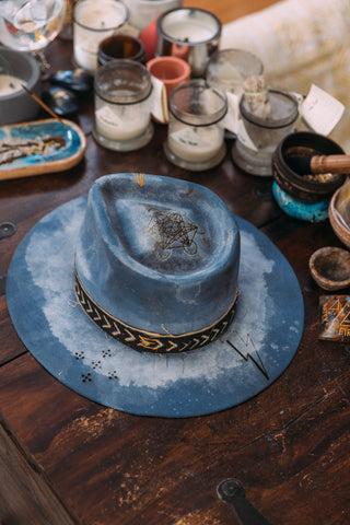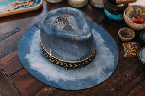 This prototype beauty is inspired by the salty air and ocean blue. It has a Metatron sacred geometry encoded on to the top of the crown slightly angled in the salt dusted distressing. It has a Bowie lightening bolt on the back of the brim with some light code dots on the other side. Gold hand accent stitching. It has a "You Are Magic" mantra on the inside sweat band. Of course a stick of selenite for the highest vibes. It has a coffee dyed linen band around the crown underneath the mud cloth.