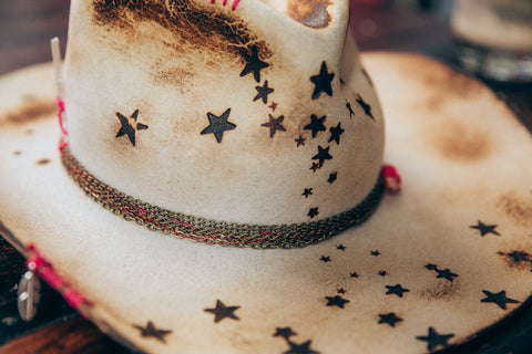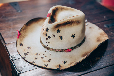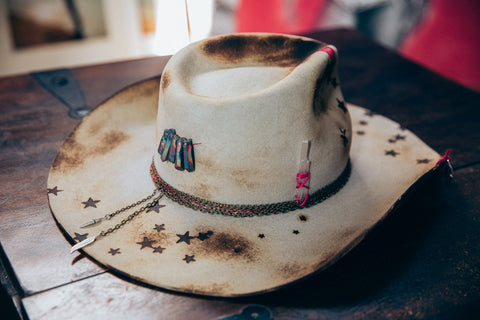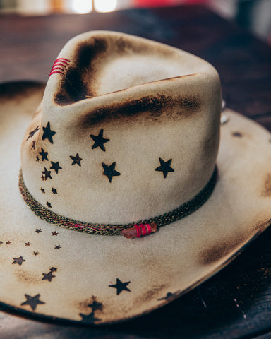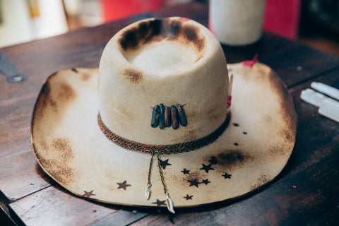 This cowboy style hat with some star magic. I’ve been obsessed with stars, I love the symbolism of dreaming and creating magic. It's a heavier western weight felt. It has a brass chain wrapped around the crown with feather charms, rainbow quartz crystals attached to the back. Pink accent stitching, and an orange quartz on the front side of the crown.