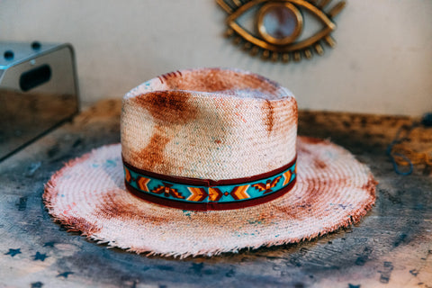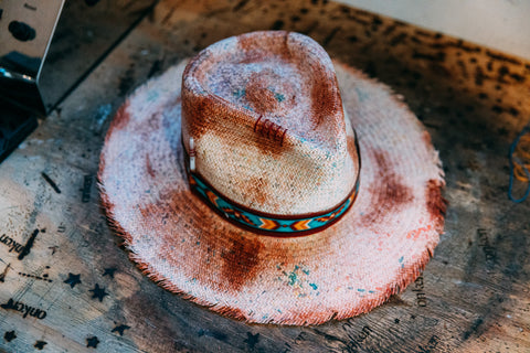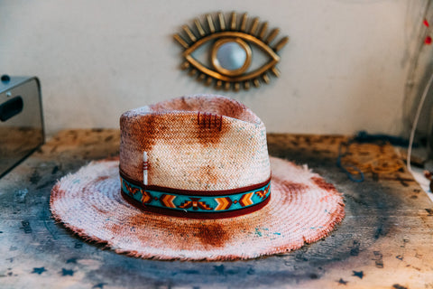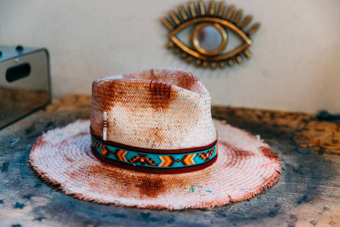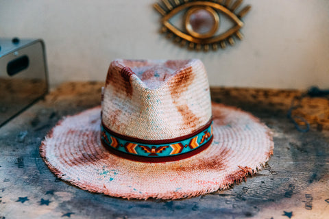 This warm weather Panama Is a brown and natural tie dye base with spray dye and a frayed edge. A southwest style band, a paint dipped stick of Selenite, and some red stitched drips down the top of the crown.