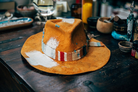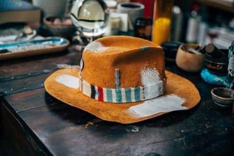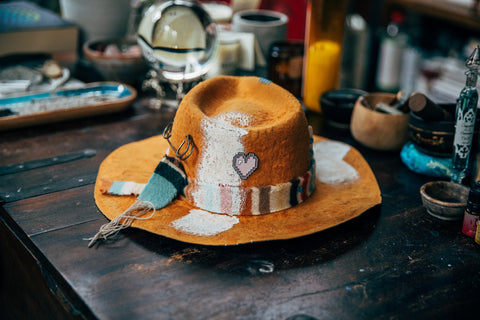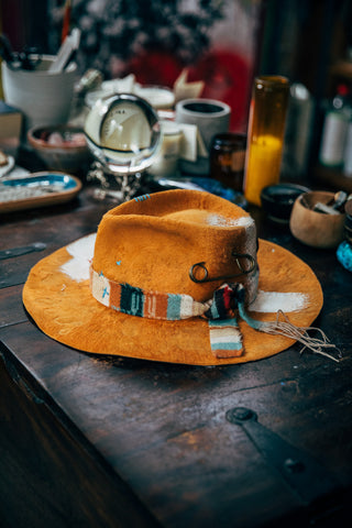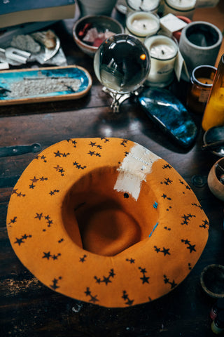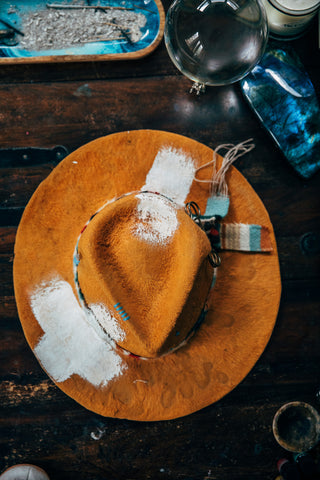 This is an orange long hair felt that has been lightly toasted. It has a Pendleton wrap around the crown and a universe of stars under the brim. Some white paint accents and a giant clothes pin(just be mindful of traveling with the clothes pin. I've the pin on one of mine confiscated before) Of course a stick of Selenite for high vibes, and some teal blue accent stitching to hold it in place. It has a digital pink heart on the back.
