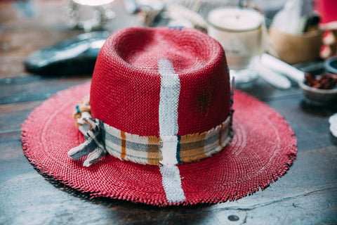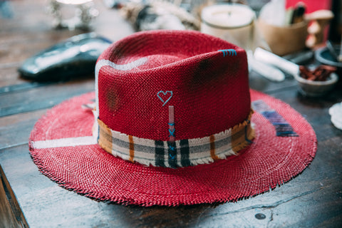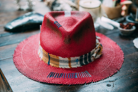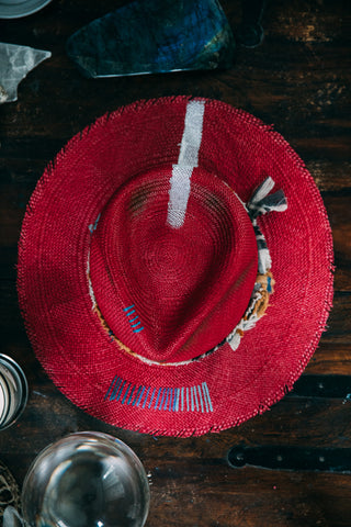 This is a red Panama has one of my favorite Pendleton fabrics wrapped around the crown. An Ankh symbol hand stitched on over the fabric. A hand stitched heart coming out of the stick of Selenite. Selenite is the highest vibrational stone. The hand stitched lines on the front of the brim represent a form of energy. Also a hand painted stripe down the back side of the hat.